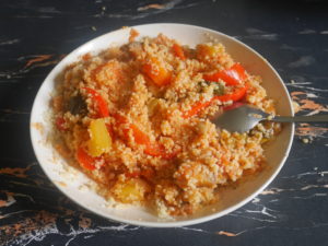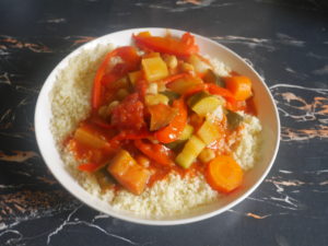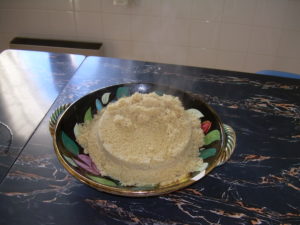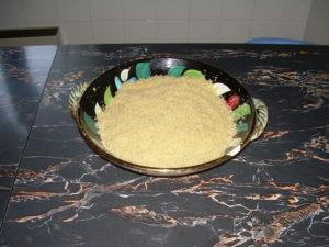 Dans un saladier, mettez une boite de couscous de 500 gr, le mouiller avec 1 petite casserole d’eau salée pendant 30 mn