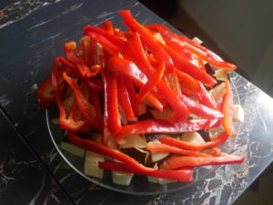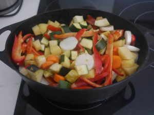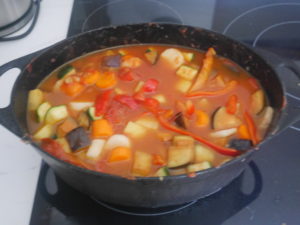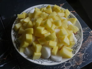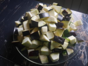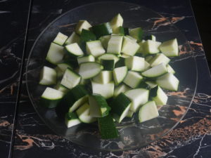 - En gros cubes : 2 pommes de terre moyennes, 2 courgettes et 1 aubergine.