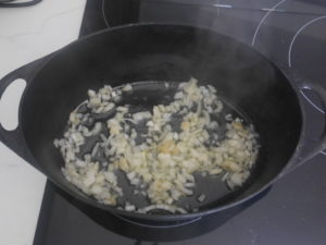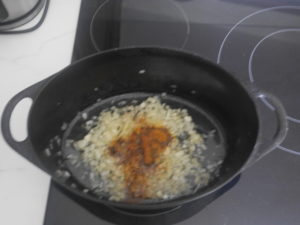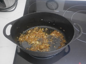 Faites revenir 6 gousses d’ail et 1 oignon préalablement émincé jusqu’à ce qu’ils soient dorés.