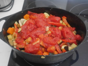 - 1 petite boite de tomates pelées que l’on coupera en 2 avec leur jus,