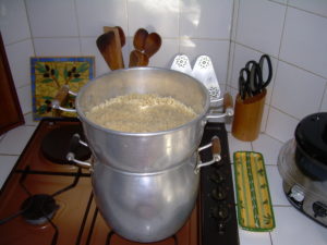 Puis, mettez le grain dans le plat du couscoussier, le couvrir et laissez cuire 10 mn jusqu’à ce que la vapeur sorte du grain.