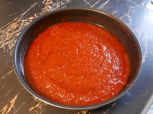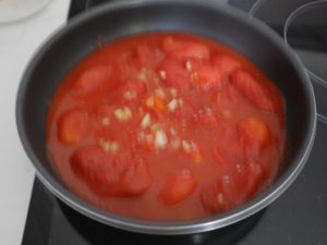 Dans une sauteuse, faites cuire, sans huile, 1 boite d’1 kg de tomates pelées avec 1 gousse d’ail coupée en morceaux, pendant 30 mn.