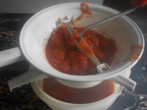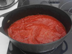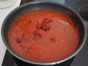 - 3 petites boites de tomates pelées et les écraser avec une cuillère en bois,