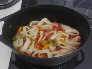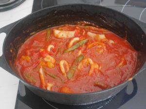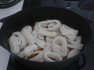 Quand ils sont cuits, ajoutez 750 gr d’anneaux d’encornets surgelés et faites cuire pendant10 mn.